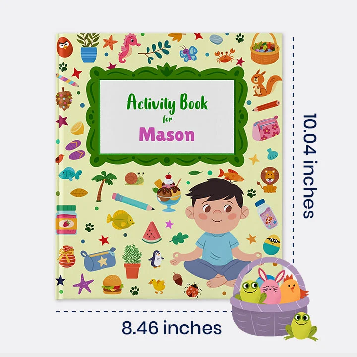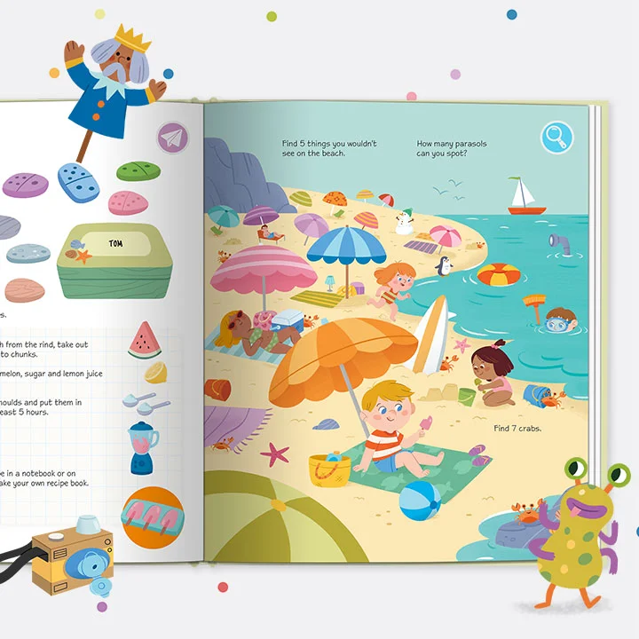 The personalized activity book with activities about the sea, cats and dogs, school, the mountain, the beach, the forest, the kitchen and the zoo.