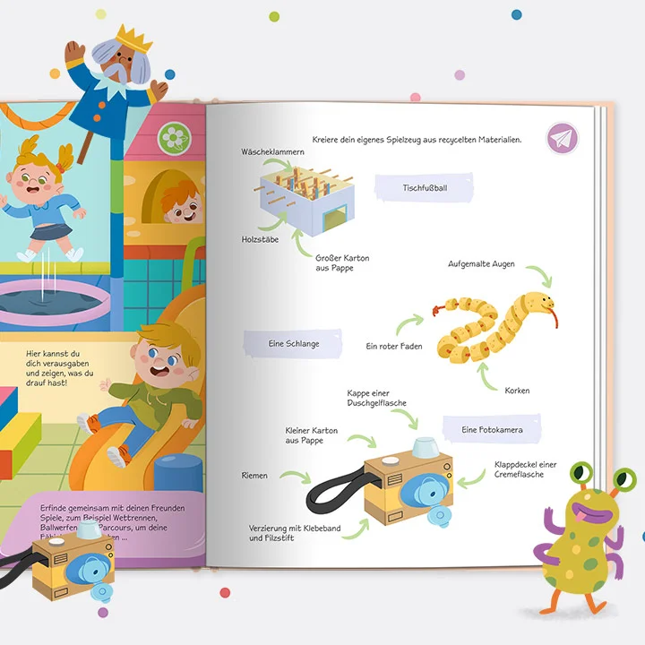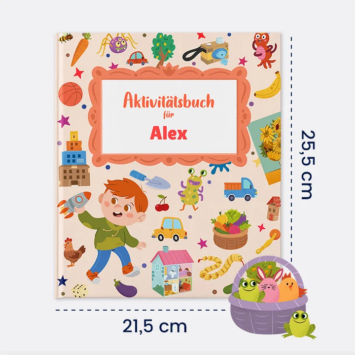 Das personalisierte Aktivitätsbuch mit Aktivitäten rund um Spielzeug, den Garten, die Stadt, den Markt, das Museum und Monster!