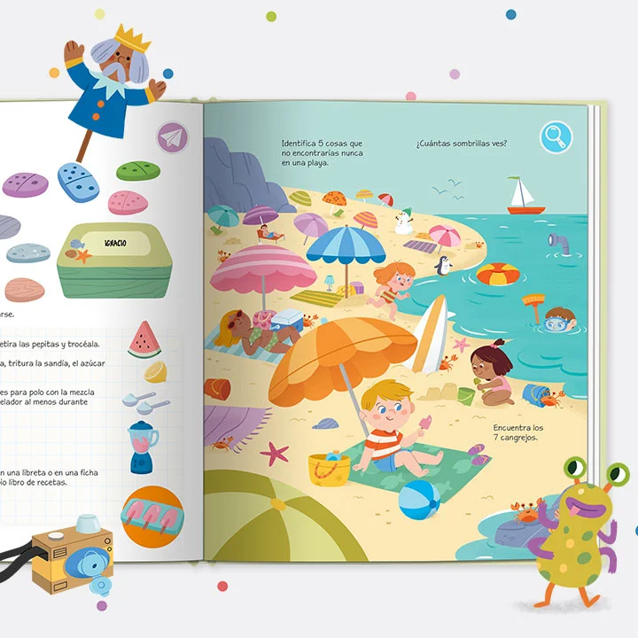 El libro personalizado con actividades sobre el mar, los gatos y los perros, la escuela, la montaña, la playa, el bosque, la cocina y el zoo.