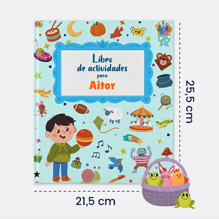 El libro personalizado con actividades sobre deportes, música, parques de atracciones, el teatro, la biblioteca, la noche, en el aire, y Halloween!