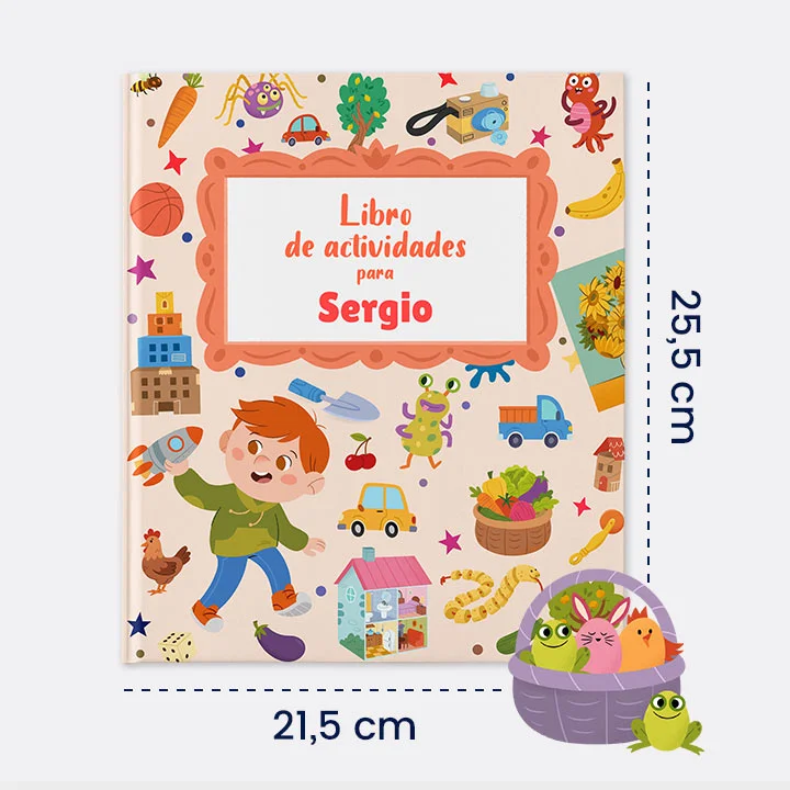 El libro personalizado con actividades sobre juguetes, el huerto, la ciudad, el mercado, el museo y los monstruos!