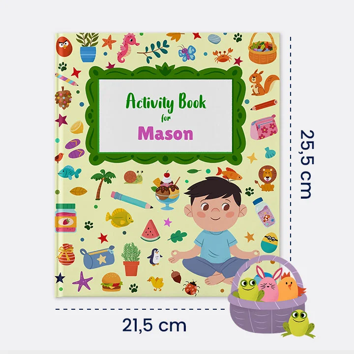 The personalised activity book with activities about the sea, cats and dogs, school, the mountain, the beach, the forest, the kitchen and the zoo.